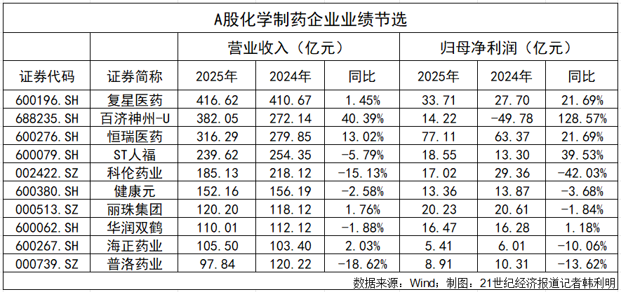 在已披露业绩的企业中,复星医药、百济神州、恒瑞医药营业收入均突破300亿元,恒瑞医药、复星医药归母净利润分别达77.11亿元、33.71亿元,百济神州则首次实现全年盈利,归母净利润达14.22亿元。