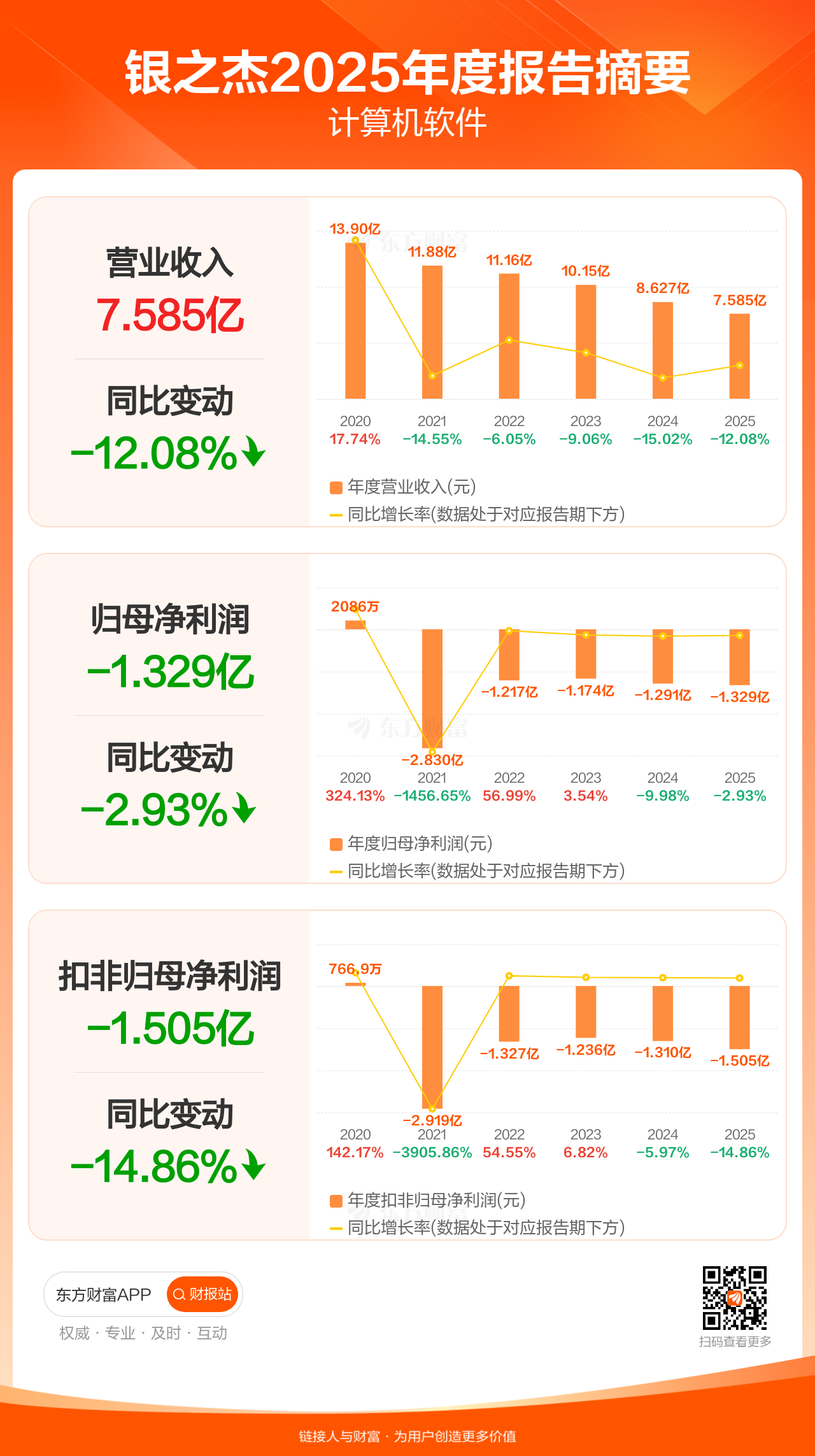银之杰4月15日发布2025年年报显示,公司全年实现营业收入7.58亿元,同比下滑12.08%;归母净利润-1.33亿元;扣非归母净利润-1.50亿元。