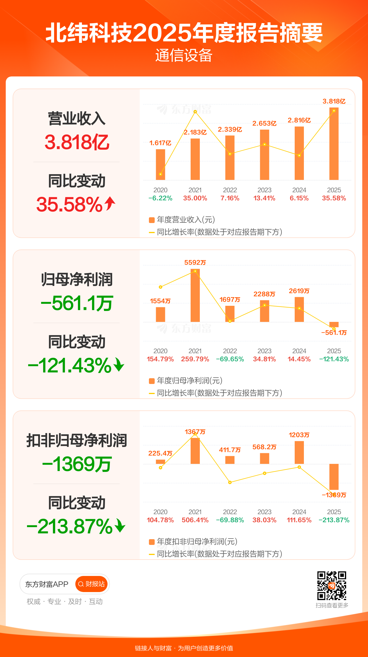 北纬科技4月15日发布2025年年报显示,公司全年实现营业收入3.82亿元,同比增长35.58%;归母净利润-561.07万元;扣非归母净利润-1369.47万元。