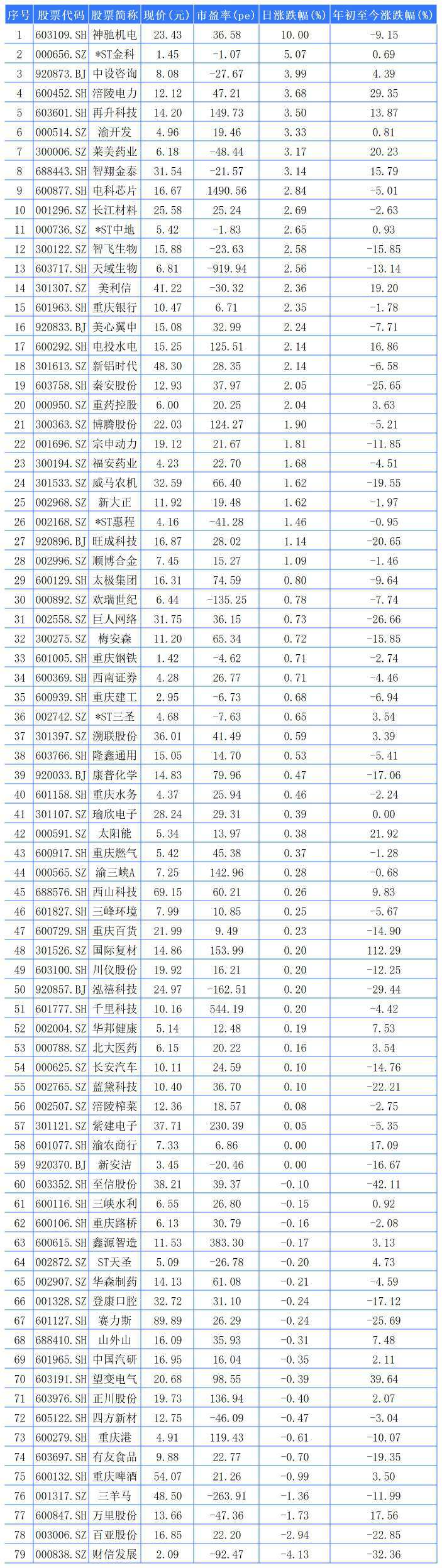 79家重庆A股上市公司中,57家上涨,2家平收,20家下跌。