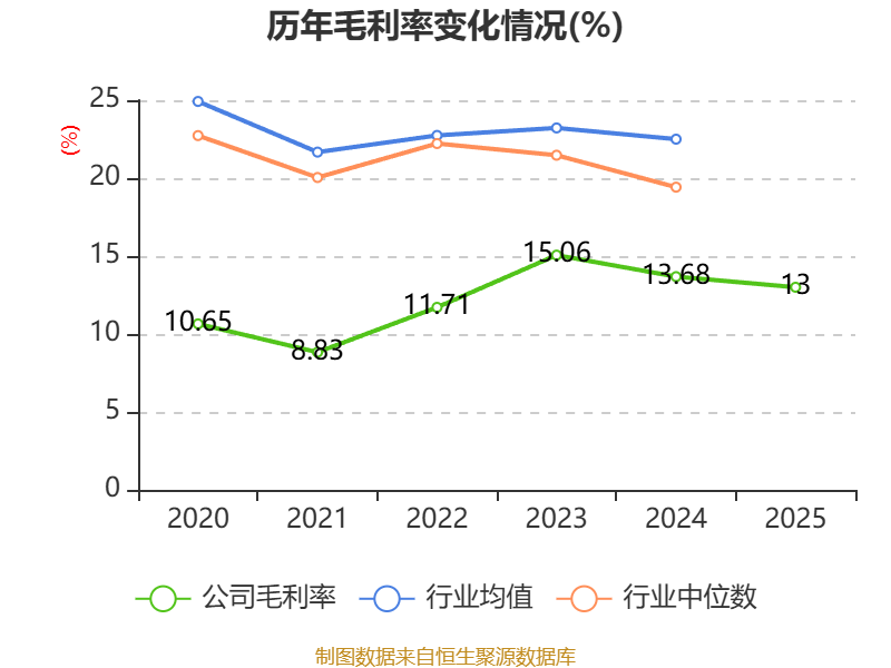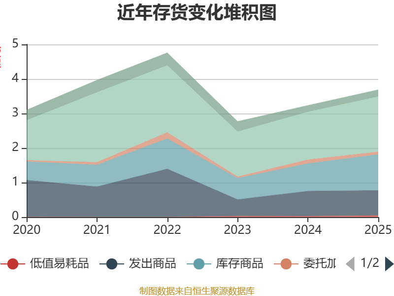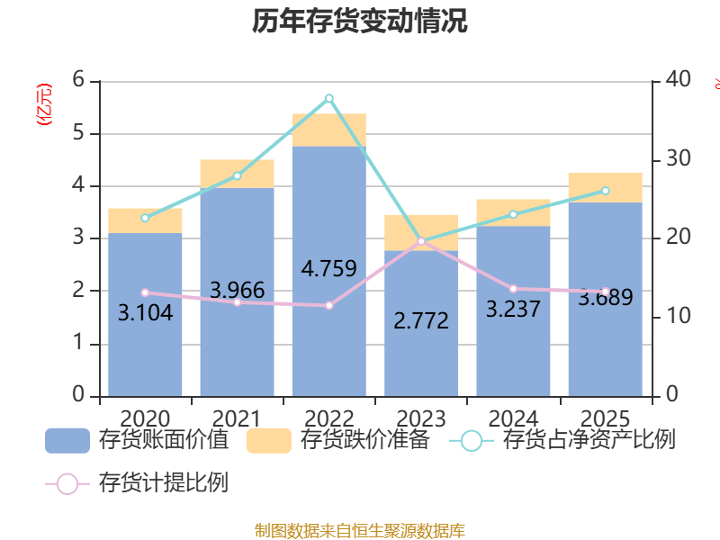 从存货变动来看,截至2025年末,公司存货账面价值为3.69亿元,占净资产的26.06%,较上年末增加4518.93万元。其中,存货跌价准备为5636.97万元,计提比例为13.26%。