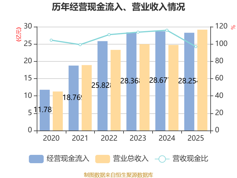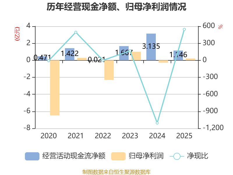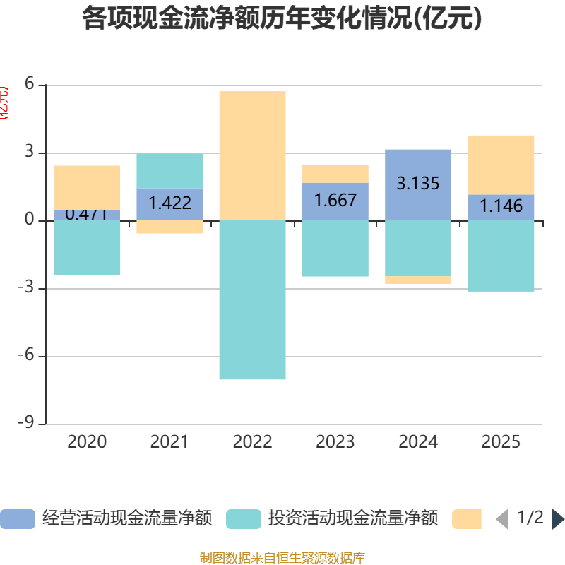 截至2025年,公司经营活动现金流净额为1.15亿元,同比下降63.45%;筹资活动现金流净额2.61亿元,同比增加2.95亿元;投资活动现金流净额-3.15亿元,上年同期为-2.47亿元。