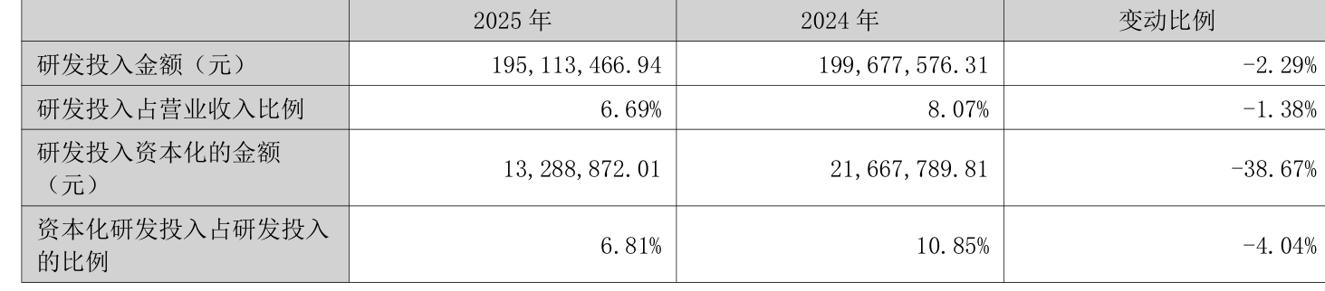 2025年全年,公司研发投入金额为1.95亿元,同比下降2.29%;研发投入占营业收入比例为6.69%,相比上年同期下降1.38个百分点。此外,公司全年研发投入资本化率为6.81%。