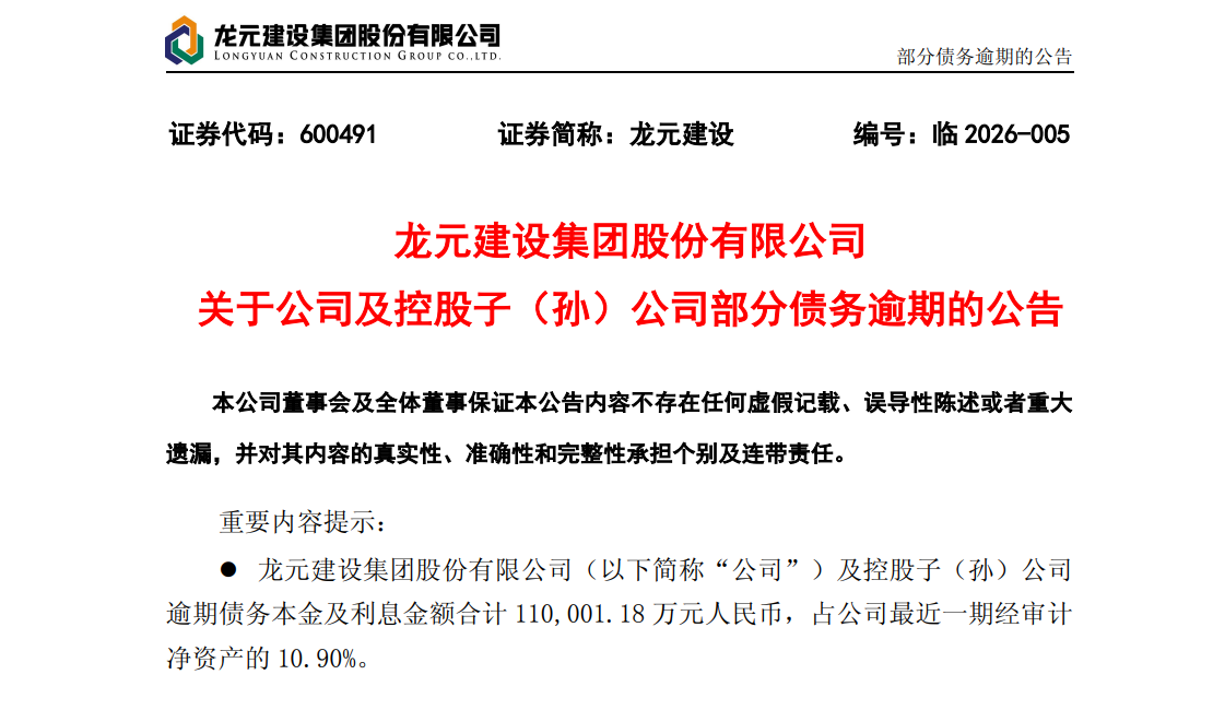 根据公告,龙元建设集团股份有限公司及控股子(孙)公司逾期债务本金及利息金额合计11亿元,占公司最近一期经审计净资产的10.90%。