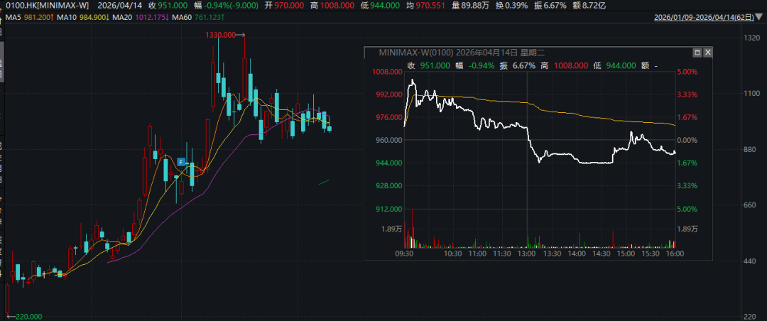 而就在不久之前,另一家港股上市公司MINIMAX股价也在3月突破1000港元,最高一度达1330港元。4月14日,MINIMAX股价继续在1000港元上下波动。