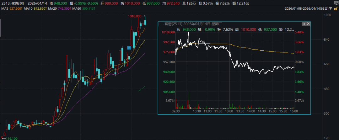 4月14日,港股上市公司智谱盘中最高价再度超过1000港元,最高一度达1010港元。此前一个交易日,智谱股价盘中首度突破1000港元,引起市场广泛关注。