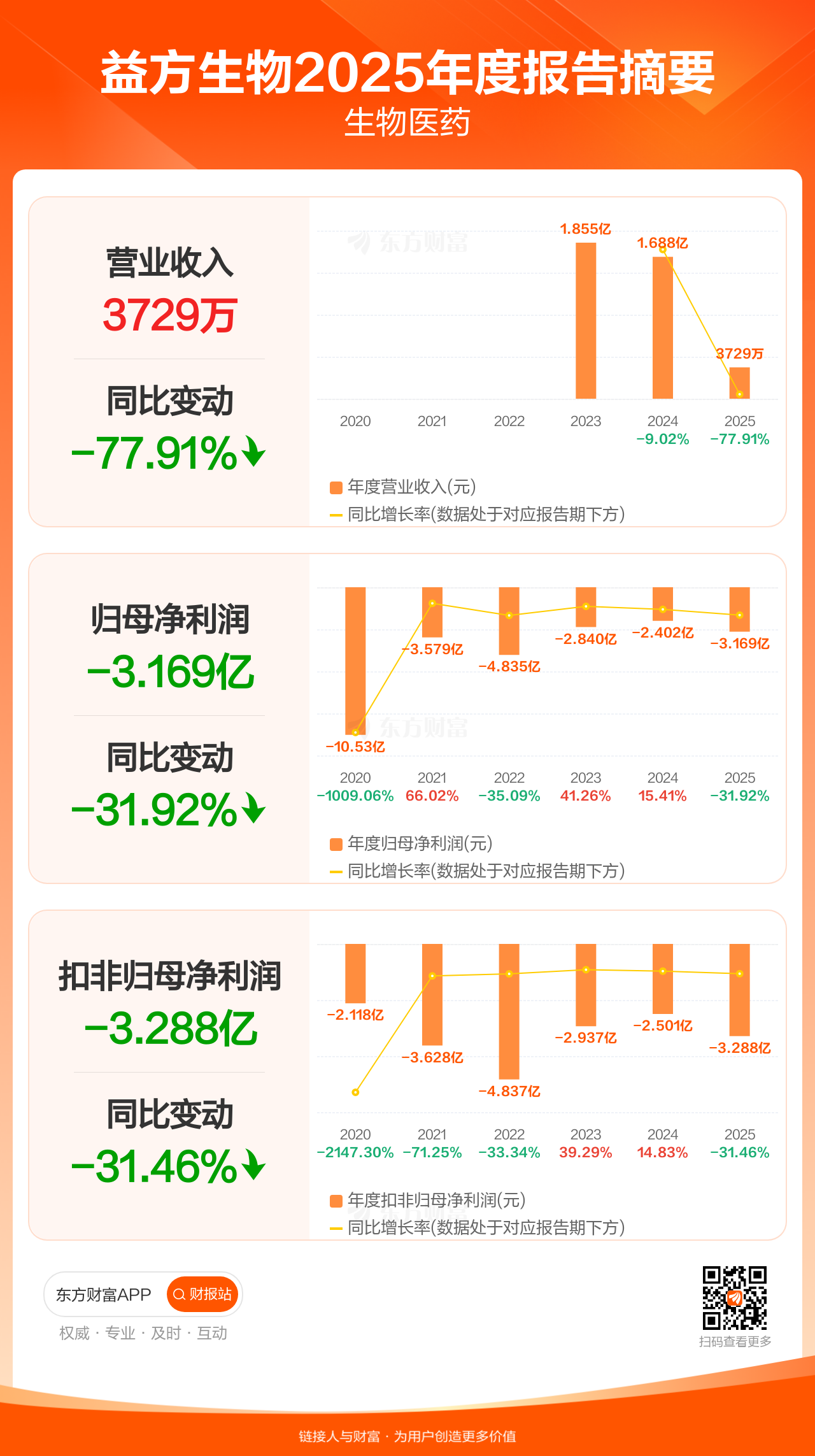 益方生物4月15日发布2025年年报显示,公司全年实现营业收入3728.97万元,同比下滑77.91%;归母净利润-3.17亿元;扣非归母净利润-3.29亿元。
