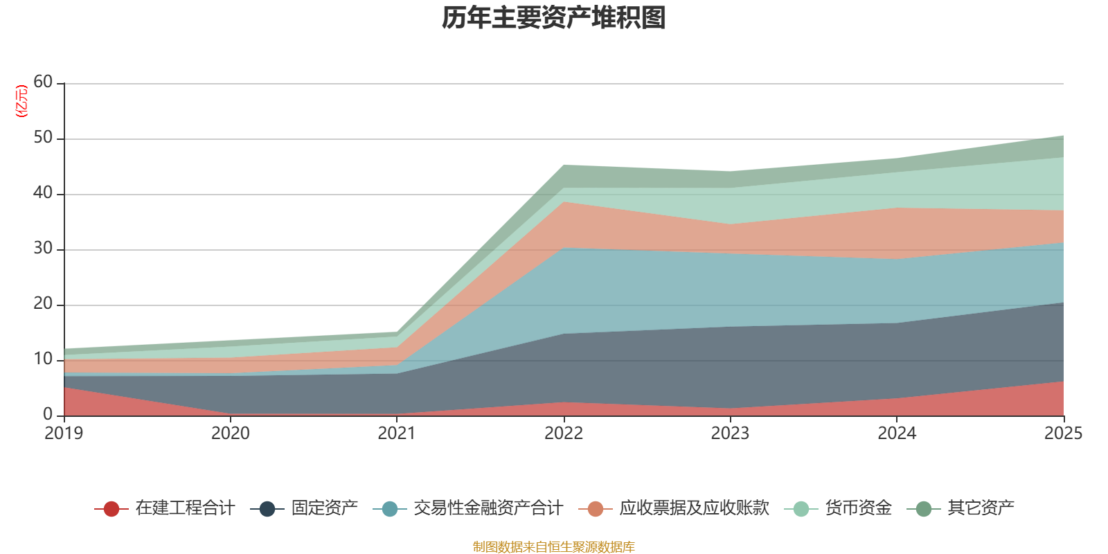 资产重大变化方面,截至2025年末,公司应收票据及应收账款较上年末减少37.43%,占公司总资产比重下降8.5个百分点;在建工程合计较上年末增加97.93%,占公司总资产比重上升5.47个百分点;货币资金较上年末增加48.99%,占公司总资产比重上升5.11个百分点;交易性金融资产合计较上年末减少6.18%,占公司总资产比重下降3.43个百分点。