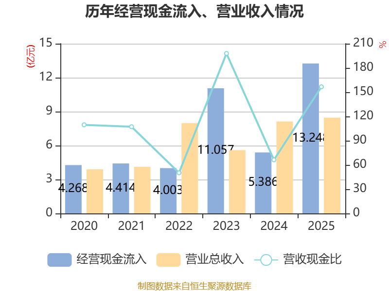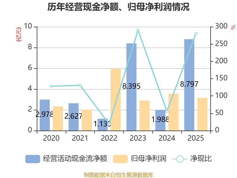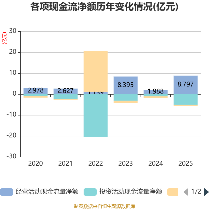 截至2025年,公司经营活动现金流净额为8.8亿元,同比增长342.37%;筹资活动现金流净额-5264.78万元,同比增加2664.03万元;投资活动现金流净额-5.12亿元,上年同期为-1.11亿元。