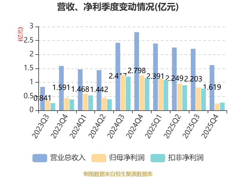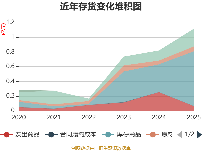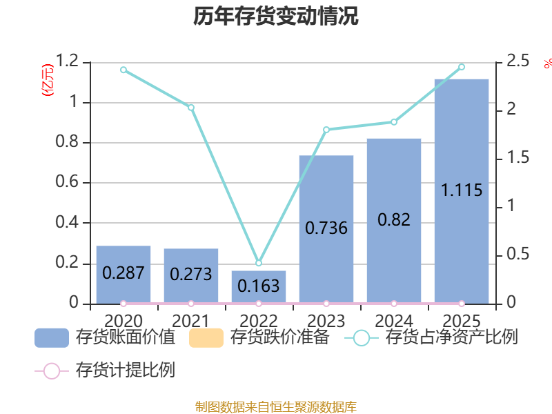 从存货变动来看,截至2025年末,公司存货账面价值为1.11亿元,占净资产的2.45%,较上年末增加2945.59万元。公司本期没有计提存货跌价准备。