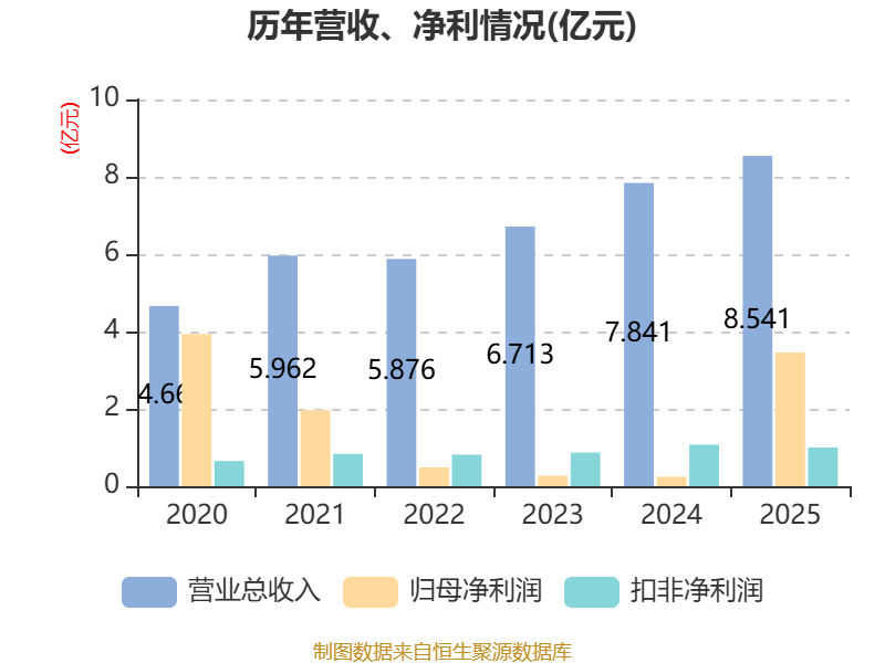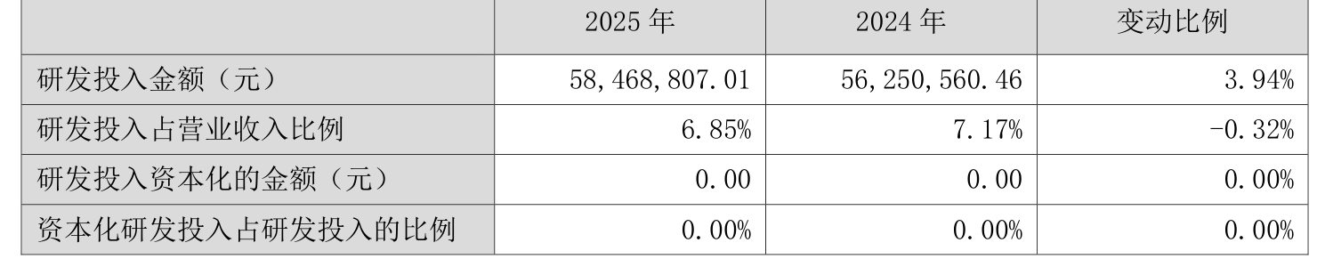 2025年全年,公司研发投入金额为5846.88万元,同比增长3.94%;研发投入占营业收入比例为6.85%,相比上年同期下降0.32个百分点。此外,公司全年研发投入资本化率为0%。