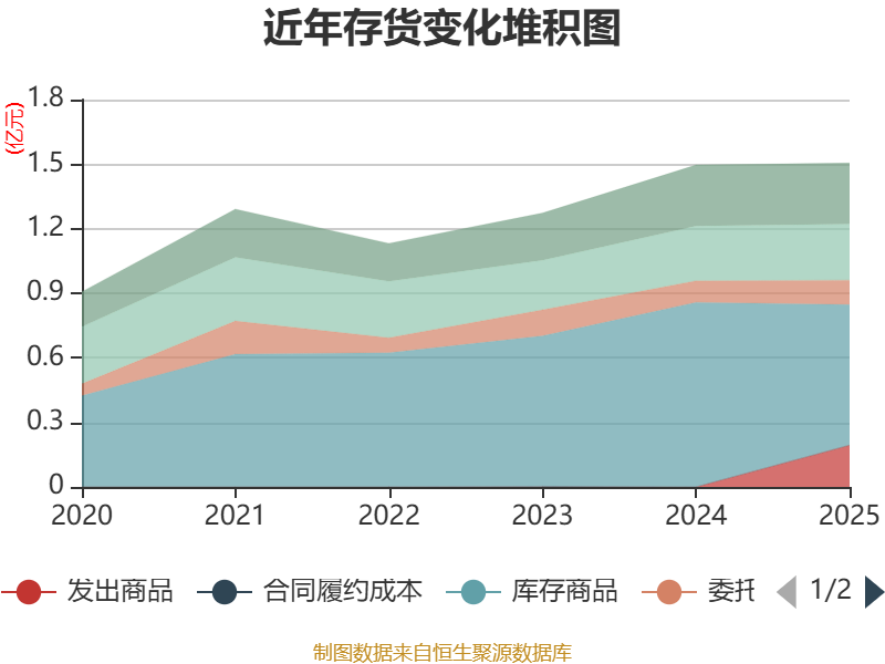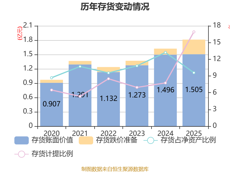 从存货变动来看,截至2025年末,公司存货账面价值为1.5亿元,占净资产的9.58%,较上年末增加86.84万元。其中,存货跌价准备为3062.04万元,计提比例为16.91%。