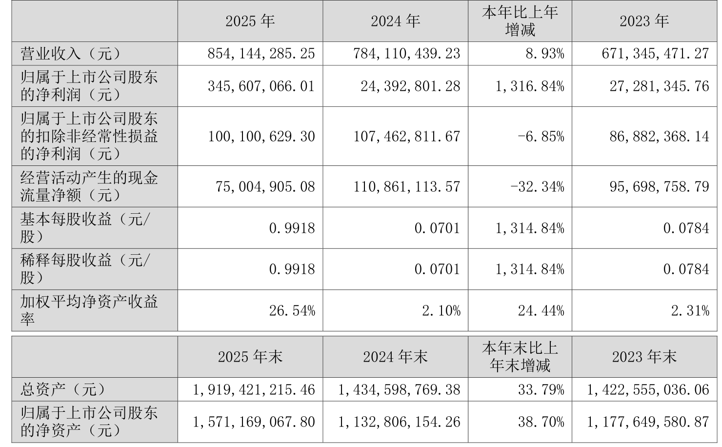 中证智能财讯南方精工(002553)4月15日披露2025年年度报告。2025年,公司实现营业总收入8.54亿元,同比增长8.93%;归母净利润3.46亿元,同比增长1316.84%;扣非净利润1亿元,同比下降6.85%;经营活动产生的现金流量净额为7500.49万元,同比下降32.34%;报告期内,南方精工基本每股收益为0.9918元,加权平均净资产收益率为26.54%。公司2025年度分配预案为:拟向全体股东每10股派现1元(含税)。