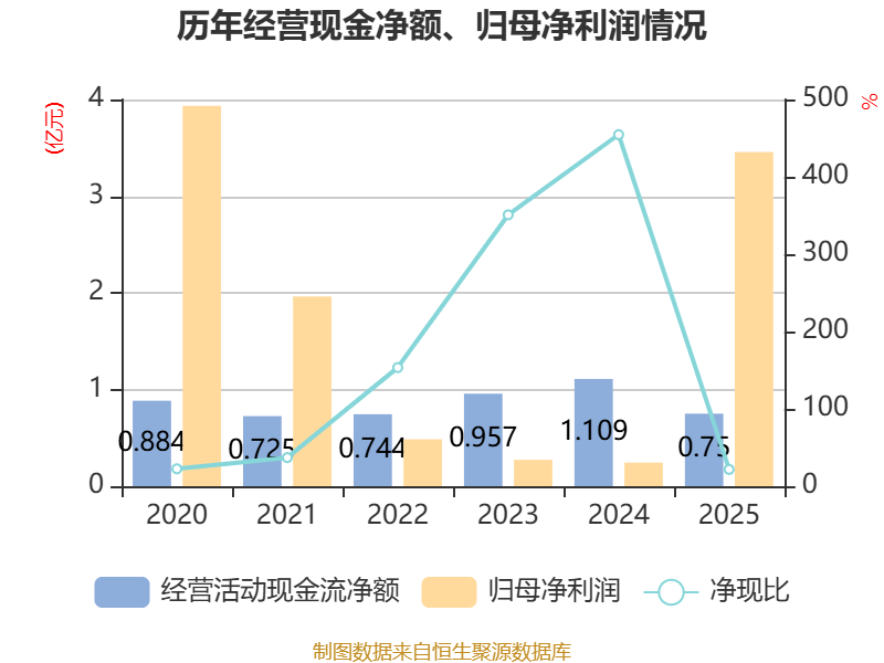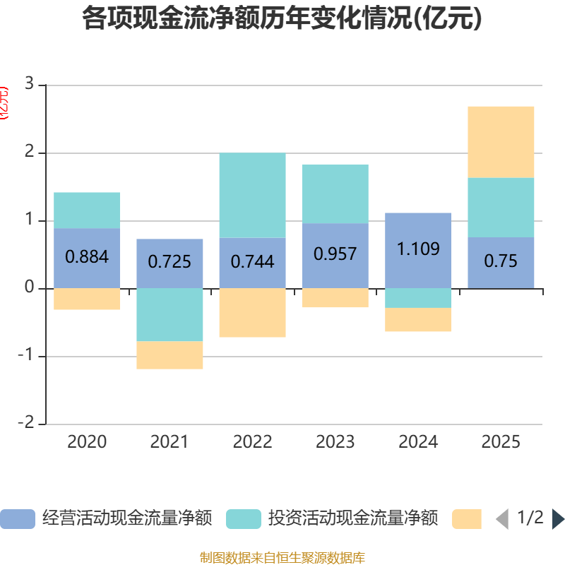 截至2025年,公司经营活动现金流净额为7500.49万元,同比下降32.34%;筹资活动现金流净额1.05亿元,同比增加1.4亿元;投资活动现金流净额8806.47万元,上年同期为-2907.28万元。