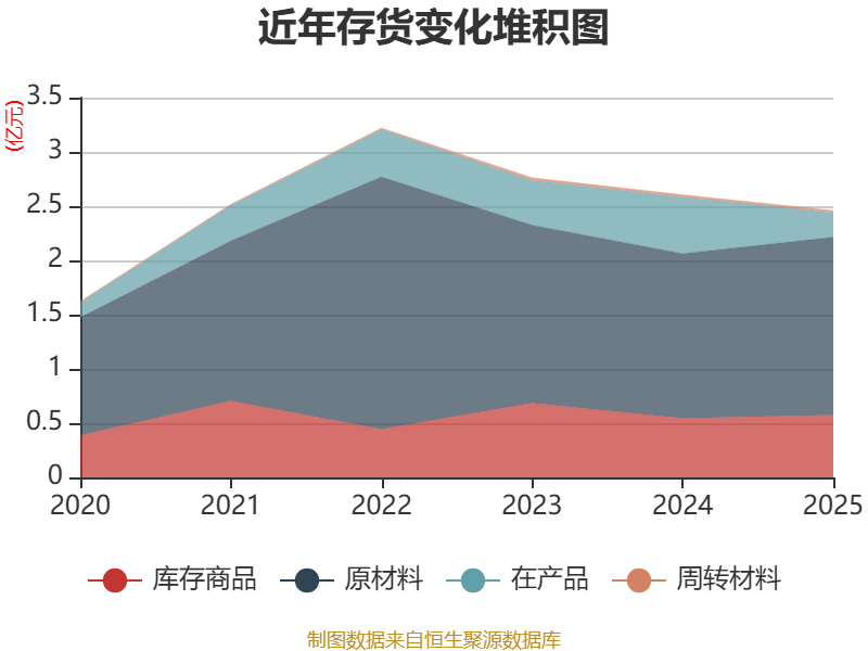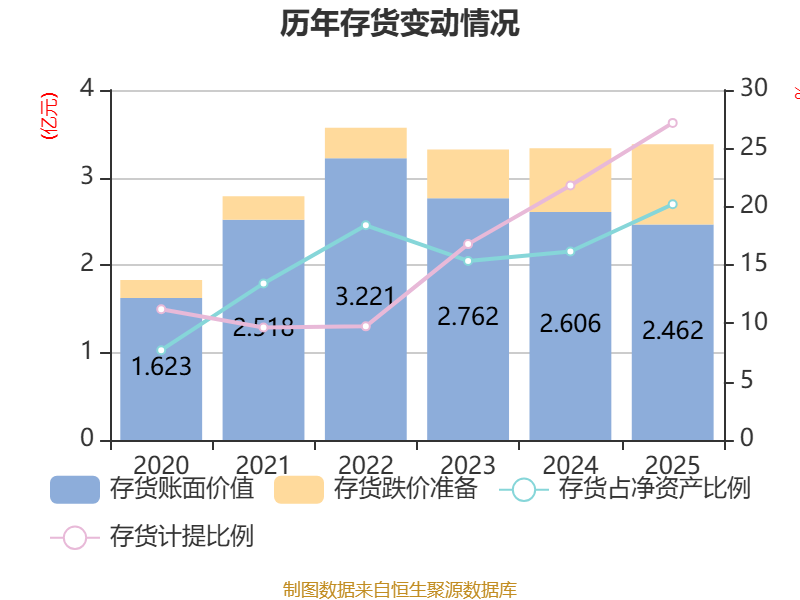 从存货变动来看,截至2025年末,公司存货账面价值为2.46亿元,占净资产的20.21%,较上年末减少1444.4万元。其中,存货跌价准备为9187.93万元,计提比例为27.18%。