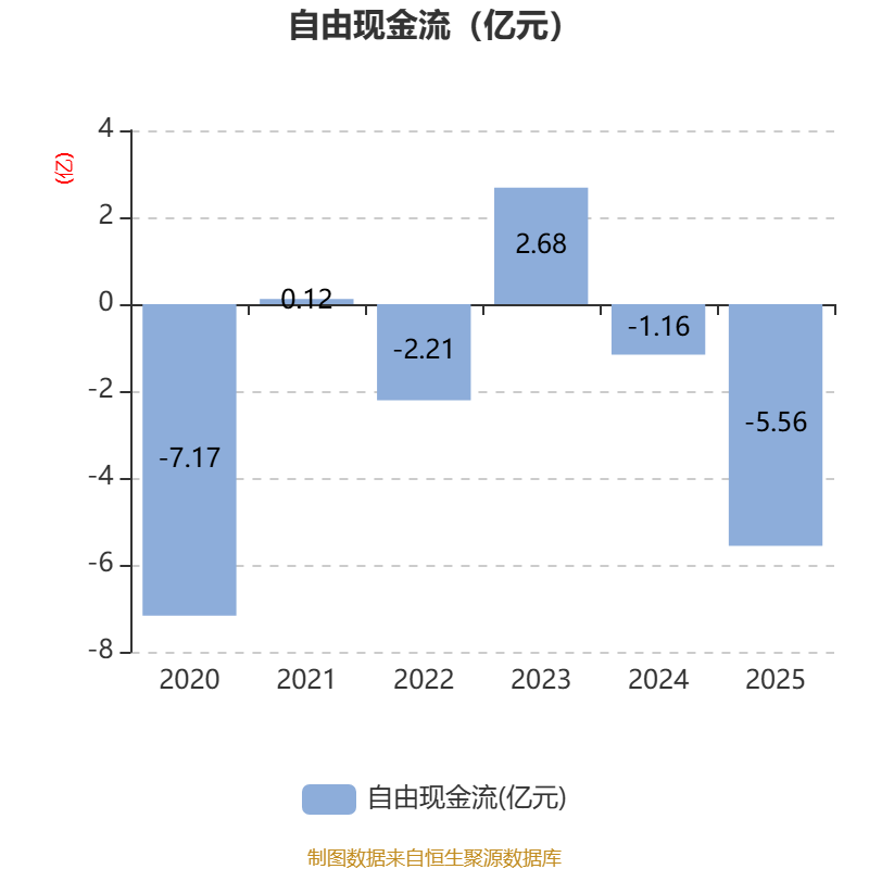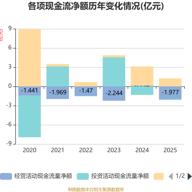 截至2025年,公司经营活动现金流净额为-1.98亿元,同比减少2.09亿元;筹资活动现金流净额1.24亿元,同比减少1.76亿元;投资活动现金流净额-1348.52万元,上年同期为-1.33亿元。