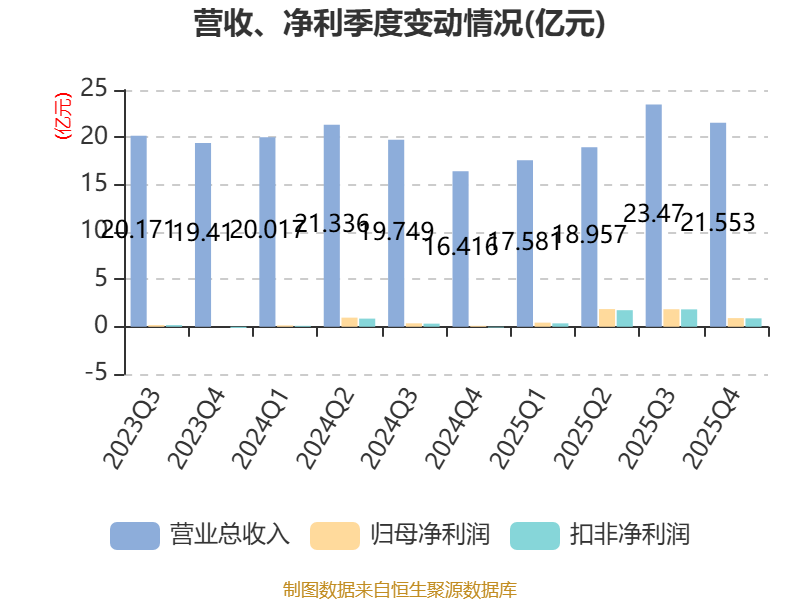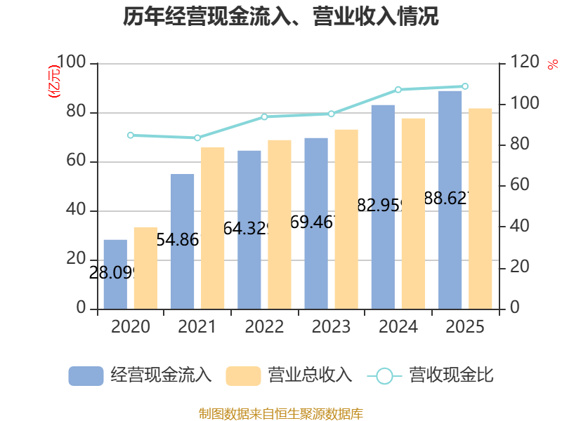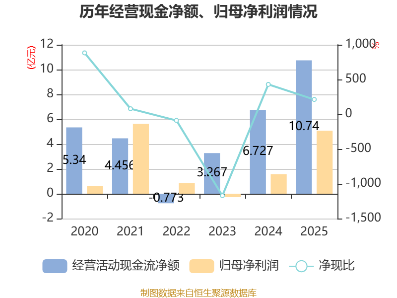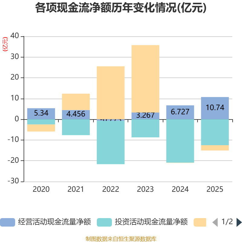 截至2025年,公司经营活动现金流净额为10.74亿元,同比增长59.65%;筹资活动现金流净额-2.57亿元,同比减少2.44亿元;投资活动现金流净额-12.48亿元,上年同期为-20.92亿元。