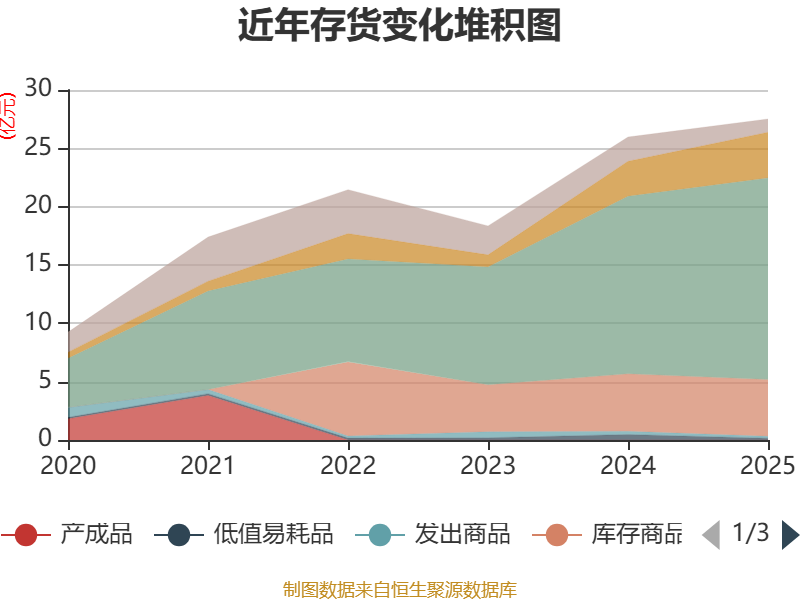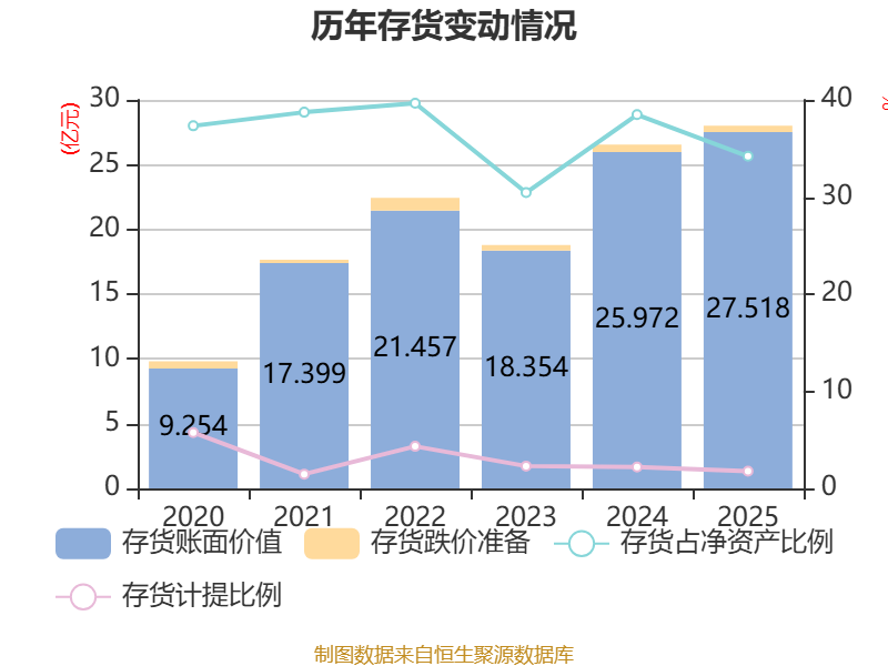 从存货变动来看,截至2025年末,公司存货账面价值为27.52亿元,占净资产的34.19%,较上年末增加1.55亿元。其中,存货跌价准备为4952.9万元,计提比例为1.77%。