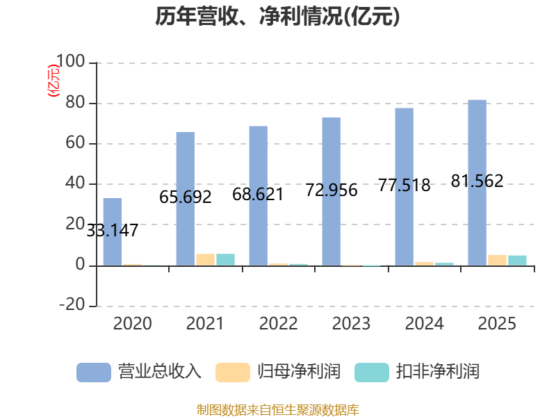 中证智能财讯道氏技术(300409)4月15日披露2025年年度报告。2025年,公司实现营业总收入81.56亿元,同比增长5.22%;归母净利润5.07亿元,同比增长223.13%;扣非净利润4.83亿元,同比增长300.15%;经营活动产生的现金流量净额为10.74亿元,同比增长59.65%;报告期内,道氏技术基本每股收益为0.6792元,加权平均净资产收益率为6.62%。公司2025年度分配预案为:拟向全体股东每10股派现2.5元(含税)。