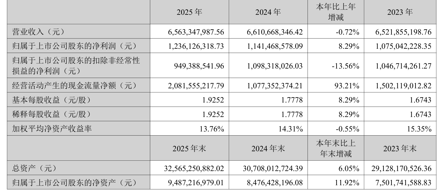 中证智能财讯城发环境(000885)4月15日披露2025年年度报告。2025年,公司实现营业总收入65.63亿元,同比下降0.72%;归母净利润12.36亿元,同比增长8.29%;扣非净利润9.49亿元,同比下降13.56%;经营活动产生的现金流量净额为20.82亿元,同比增长93.21%;报告期内,城发环境基本每股收益为1.9252元,加权平均净资产收益率为13.76%。公司2025年度分配预案为:拟向全体股东每10股派现3.86元(含税)。