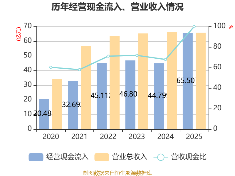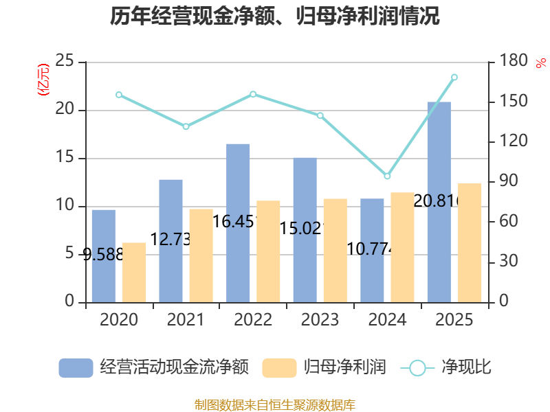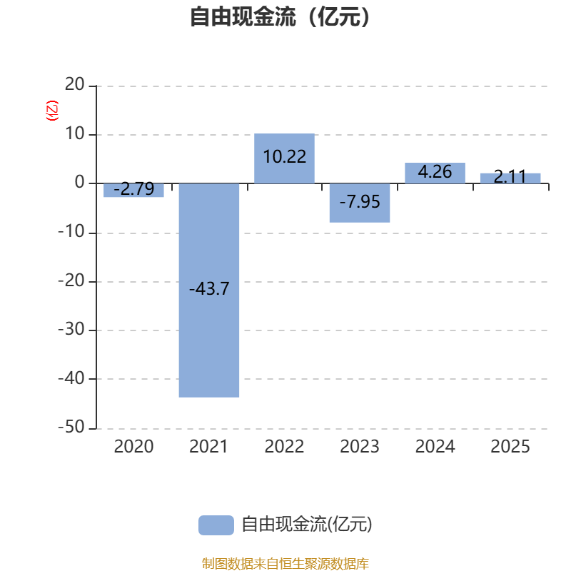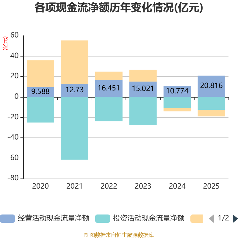截至2025年,公司经营活动现金流净额为20.82亿元,同比增长93.21%;筹资活动现金流净额-6.5亿元,同比减少3.47亿元;投资活动现金流净额-12.64亿元,上年同期为-11.08亿元。