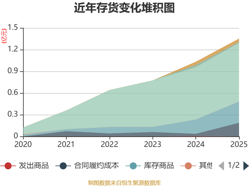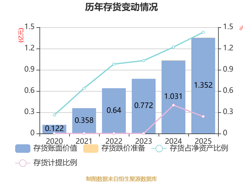 从存货变动来看,截至2025年末,公司存货账面价值为1.35亿元,占净资产的1.43%,较上年末增加3209.81万元。其中,存货跌价准备为32.41万元,计提比例为0.24%。
