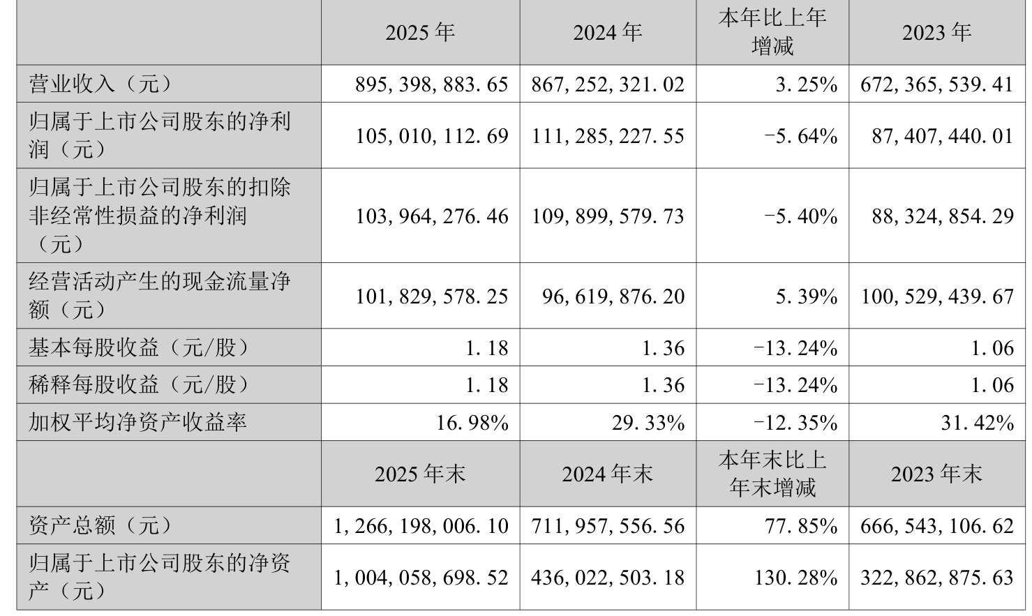 中证智能财讯昊创瑞通(301668)4月15日披露2025年年度报告。2025年,公司实现营业总收入8.95亿元,同比增长3.25%;归母净利润1.05亿元,同比下降5.64%;扣非净利润1.04亿元,同比下降5.40%;经营活动产生的现金流量净额为1.02亿元,同比增长5.39%;报告期内,昊创瑞通基本每股收益为1.18元,加权平均净资产收益率为16.98%。