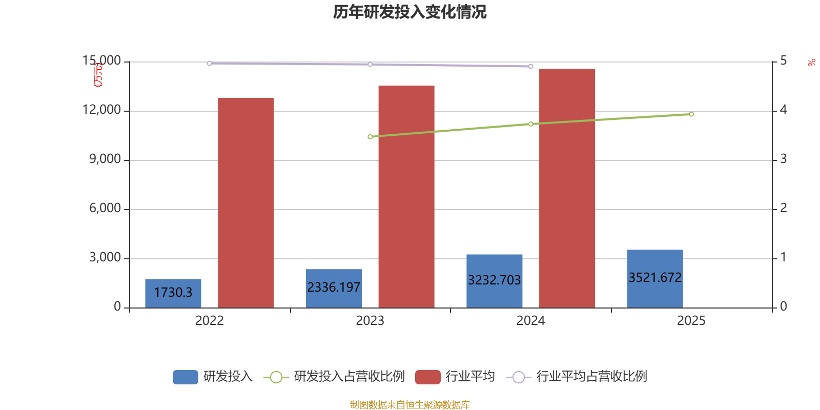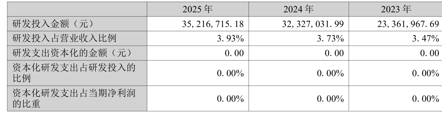 2025年全年,公司研发投入金额为3521.67万元,同比增长8.94%;研发投入占营业收入比例为3.93%,相比上年同期上升0.2个百分点。此外,公司全年研发投入资本化率为0%。