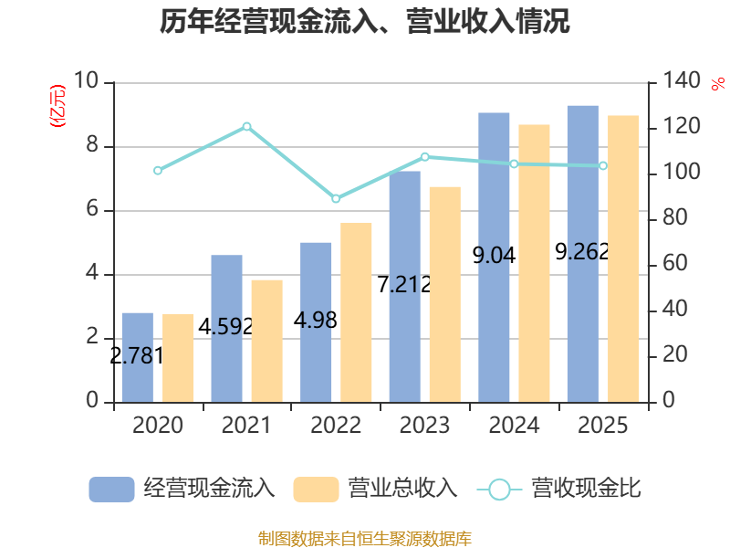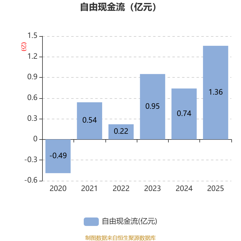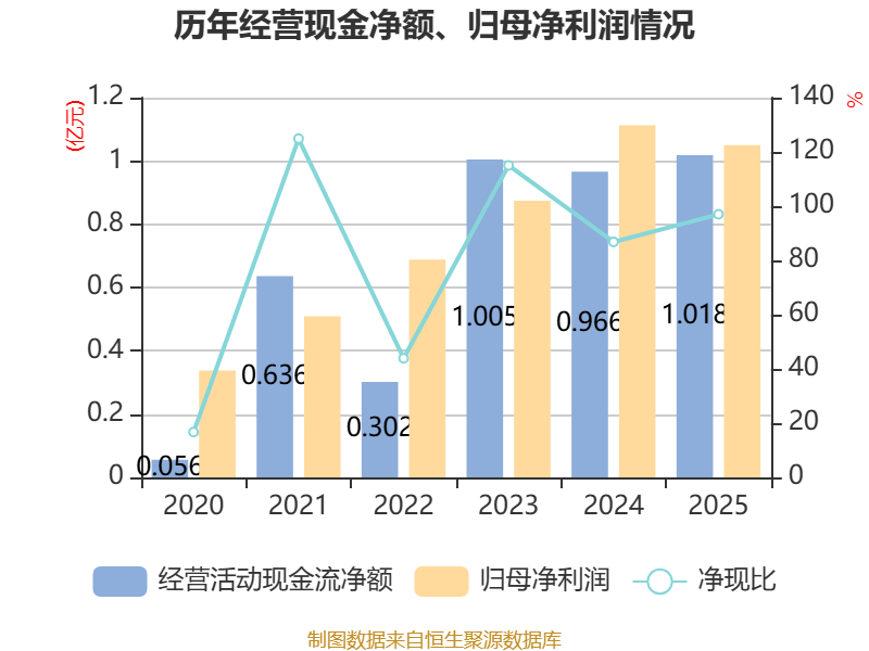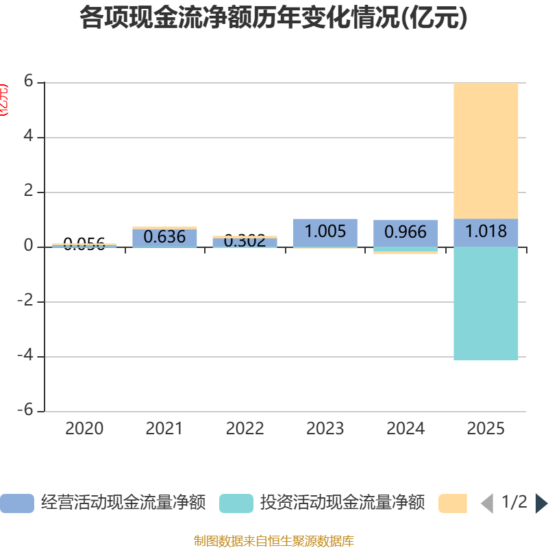 截至2025年,公司经营活动现金流净额为1.02亿元,同比增长5.39%;筹资活动现金流净额4.96亿元,同比增加5.05亿元;投资活动现金流净额-4.15亿元,上年同期为-1736.97万元。