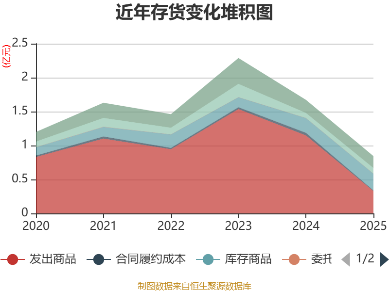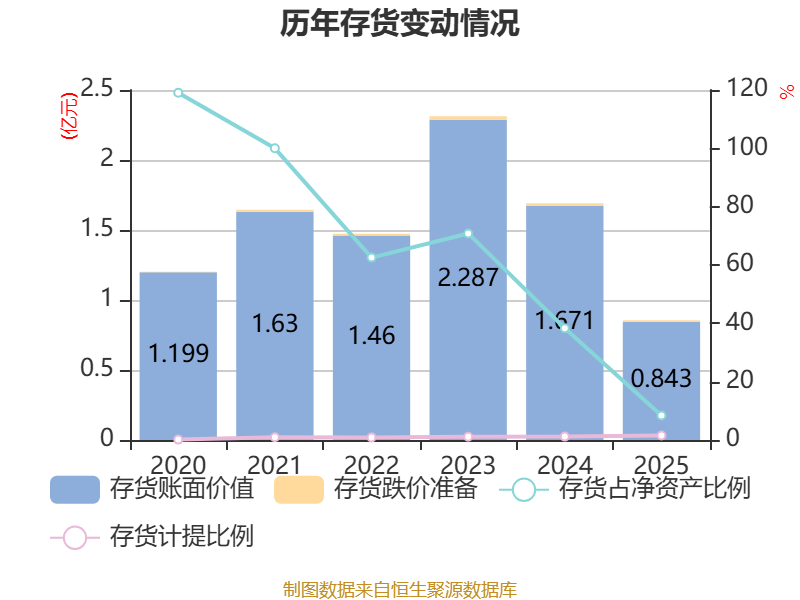 从存货变动来看,截至2025年末,公司存货账面价值为8434.8万元,占净资产的8.4%,较上年末减少8277.45万元。其中,存货跌价准备为130.26万元,计提比例为1.52%。