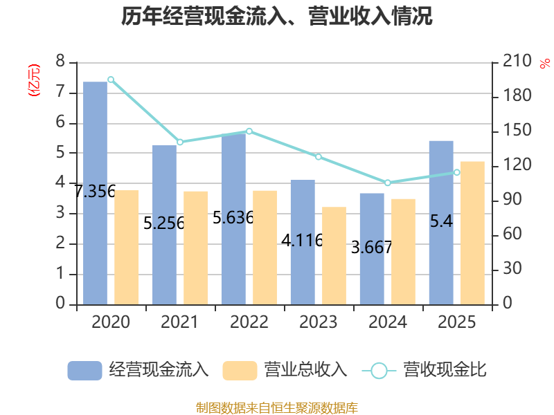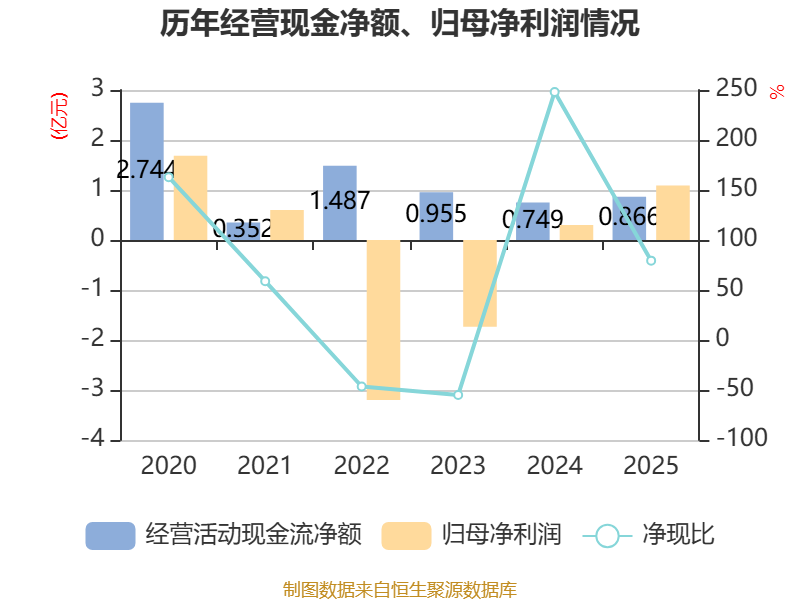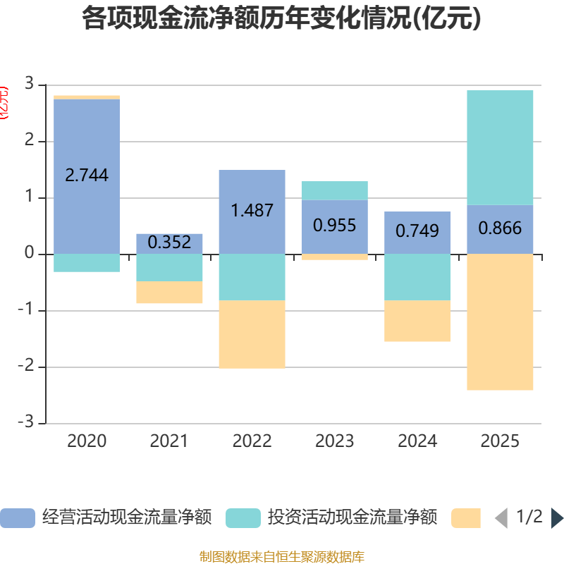 截至2025年,公司经营活动现金流净额为8659.19万元,同比增长15.54%;筹资活动现金流净额-2.42亿元,同比减少1.69亿元;投资活动现金流净额2.03亿元,上年同期为-8291.54万元。