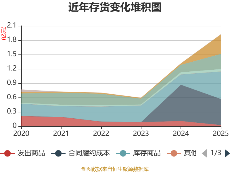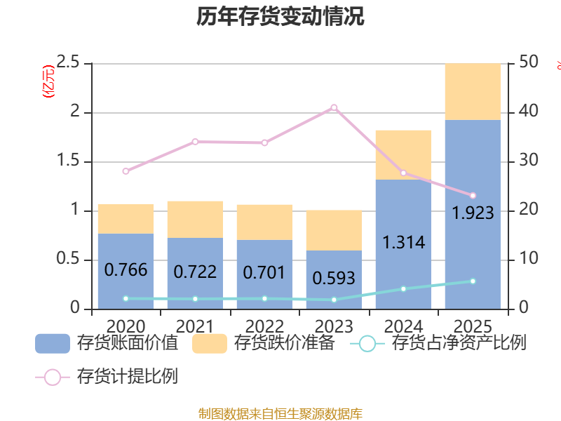 从存货变动来看,截至2025年末,公司存货账面价值为1.92亿元,占净资产的5.61%,较上年末增加6088.25万元。其中,存货跌价准备为5757.45万元,计提比例为23.04%。