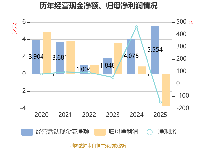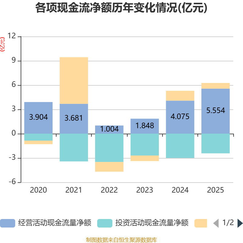 截至2025年,公司经营活动现金流净额为5.55亿元,同比增长36.28%;筹资活动现金流净额7009.67万元,同比减少5143.92万元;投资活动现金流净额-2.43亿元,上年同期为-3亿元。