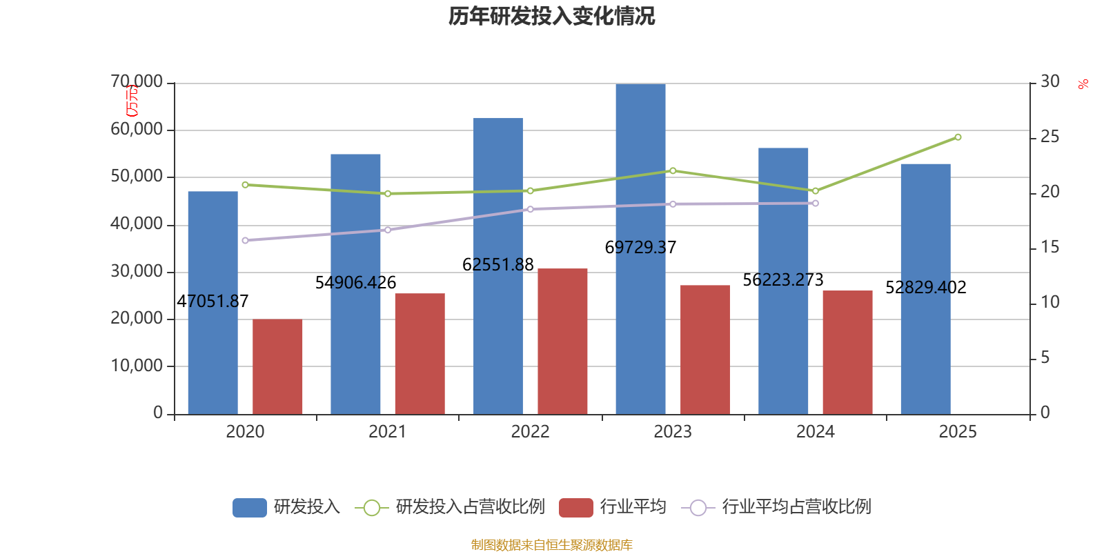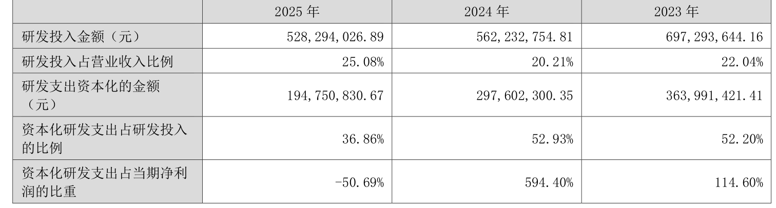 2025年全年,公司研发投入金额为5.28亿元,同比下降6.04%;研发投入占营业收入比例为25.08%,相比上年同期上升4.87个百分点。此外,公司全年研发投入资本化率为36.86%。