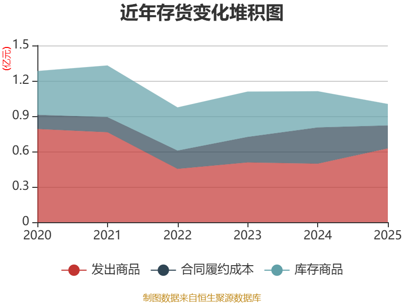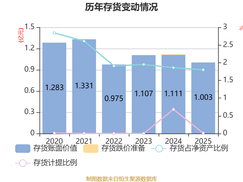 从存货变动来看,截至2025年末,公司存货账面价值为1亿元,占净资产的1.8%,较上年末减少1081.54万元。其中,存货跌价准备为1.15万元,计提比例为0.01%。