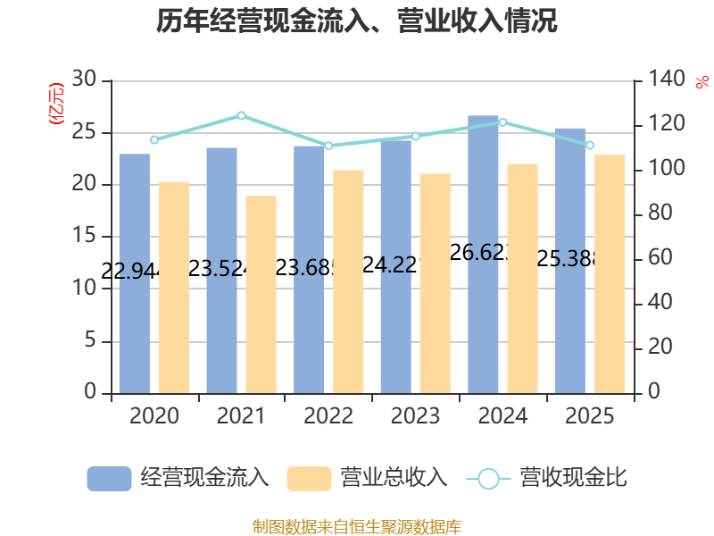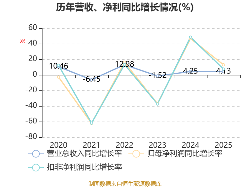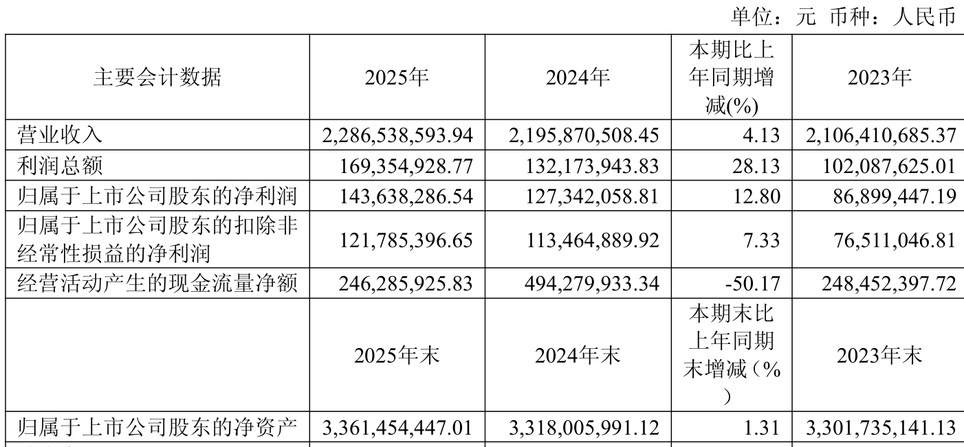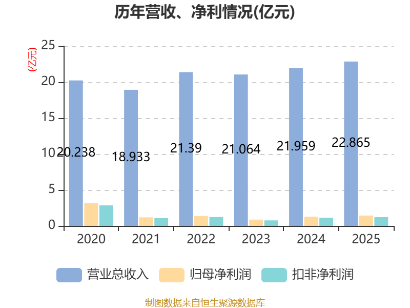 中证智能财讯恒顺醋业(600305)4月15日披露2025年年度报告。2025年,公司实现营业总收入22.87亿元,同比增长4.13%;归母净利润1.44亿元,同比增长12.80%;扣非净利润1.22亿元,同比增长7.33%;经营活动产生的现金流量净额为2.46亿元,同比下降50.17%;报告期内,恒顺醋业基本每股收益为0.13元,加权平均净资产收益率为4.27%。公司2025年度分配预案为:拟向全体股东每10股派现1.2元(含税)。