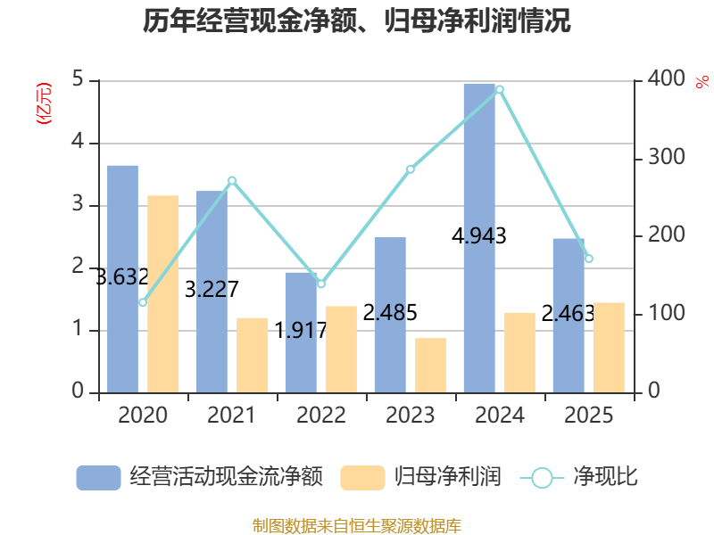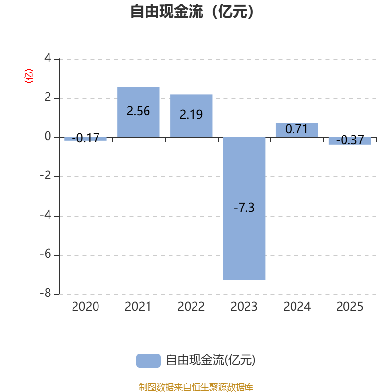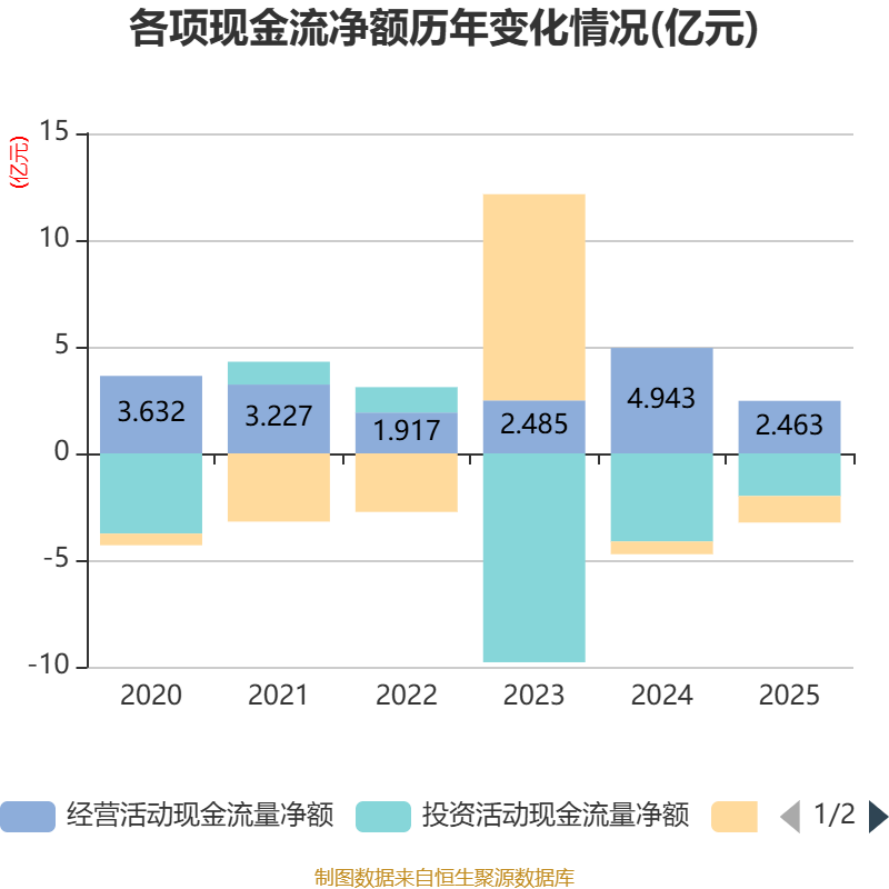 截至2025年,公司经营活动现金流净额为2.46亿元,同比下降50.17%;筹资活动现金流净额-1.24亿元,同比减少6480.07万元;投资活动现金流净额-2亿元,上年同期为-4.13亿元。