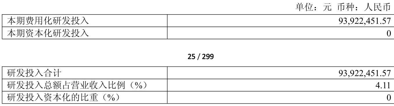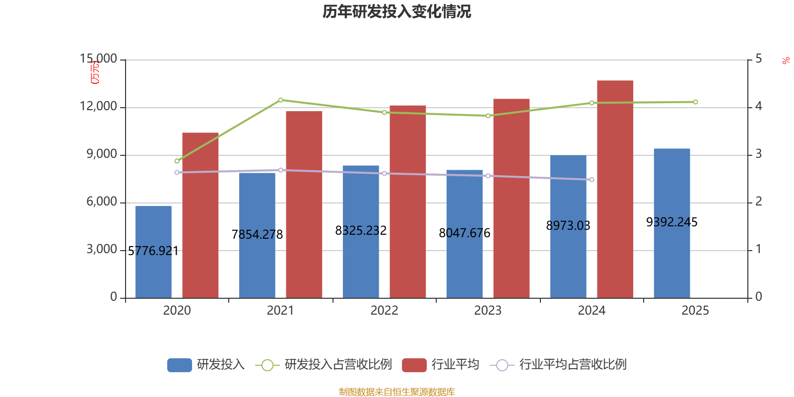 2025年全年,公司研发投入金额为9392.25万元,同比增长4.67%;研发投入占营业收入比例为4.11%,相比上年同期上升0.02个百分点。此外,公司全年研发投入资本化率为0%。