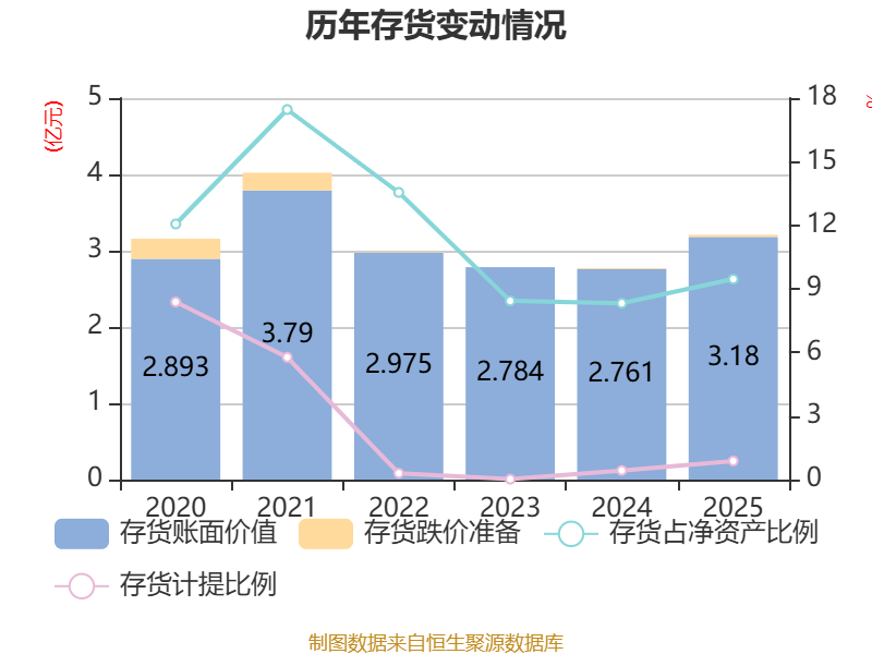从存货变动来看,截至2025年末,公司存货账面价值为3.18亿元,占净资产的9.46%,较上年末增加4184.08万元。其中,存货跌价准备为282.19万元,计提比例为0.88%。