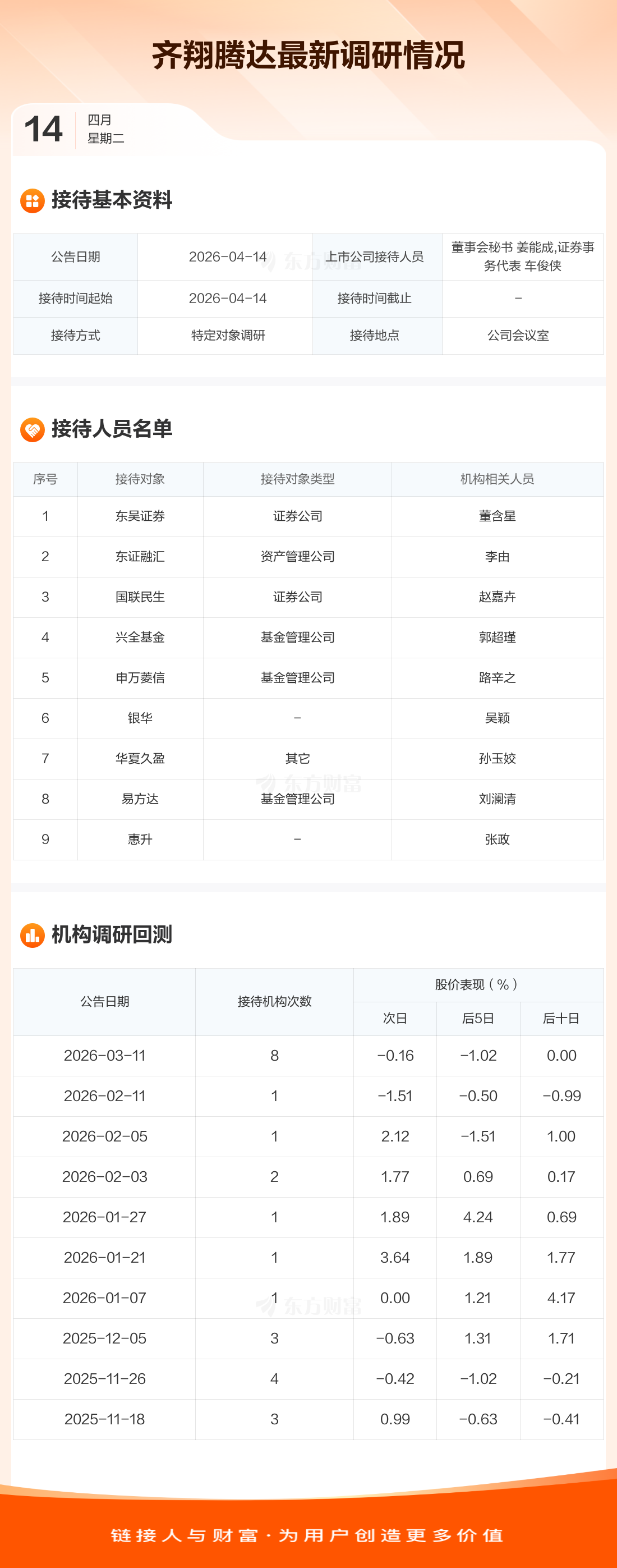 齐翔腾达4月14日公告称,4月14日接待东吴证券等9家机构调研。接待人员包括董事会秘书 姜能成,证券事务代表 车俊侠。