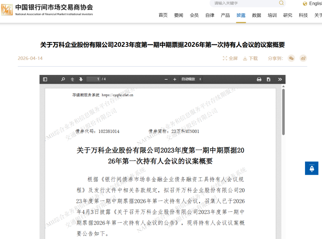 4月14日,万科在中国银行间市场交易商协会官网披露了“关于万科企业股份有限公司2023年度第一期中期票据2026年第一次持有人会议的议案概要”。