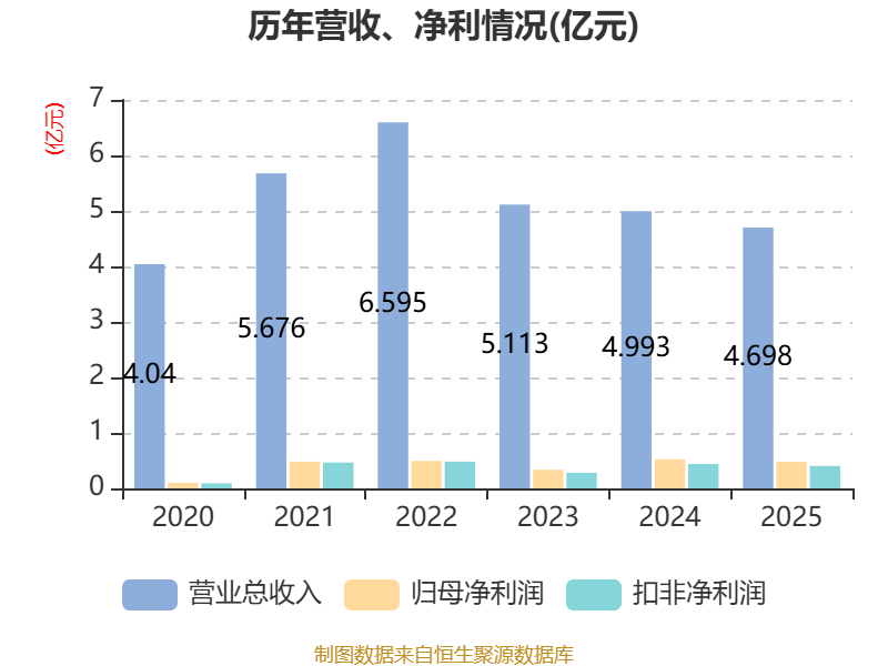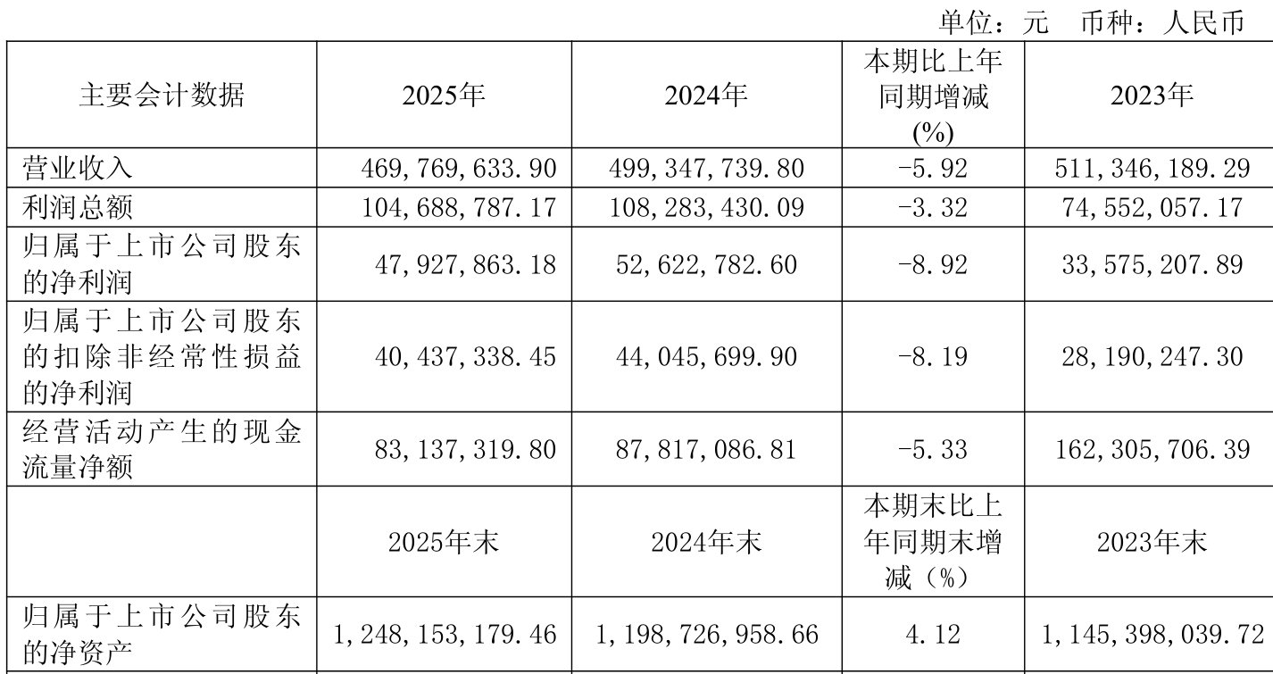 中证智能财讯金牛化工(600722)4月15日披露2025年年度报告。2025年,公司实现营业总收入4.7亿元,同比下降5.92%;归母净利润4792.79万元,同比下降8.92%;扣非净利润4043.73万元,同比下降8.19%;经营活动产生的现金流量净额为8313.73万元,同比下降5.33%;报告期内,金牛化工基本每股收益为0.0704元,加权平均净资产收益率为3.92%。