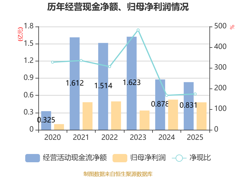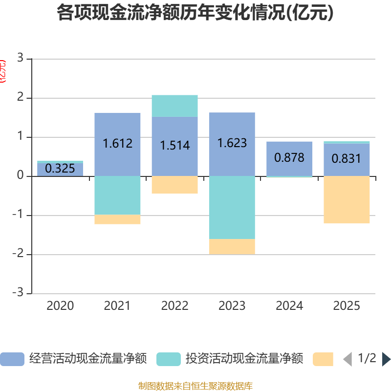 截至2025年,公司经营活动现金流净额为8313.73万元,同比下降5.33%;筹资活动现金流净额-1.21亿元,同比减少1.21亿元;投资活动现金流净额562.86万元,上年同期为-374.21万元。