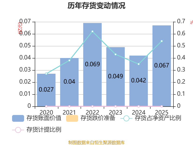 从存货变动来看,截至2025年末,公司存货账面价值为674.54万元,占净资产的0.54%,较上年末增加254.99万元。公司本期没有计提存货跌价准备。