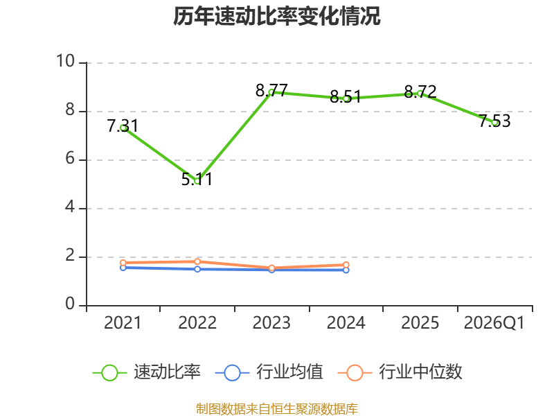 2026年第一季度,公司流动比率为7.54,速动比率为7.53。