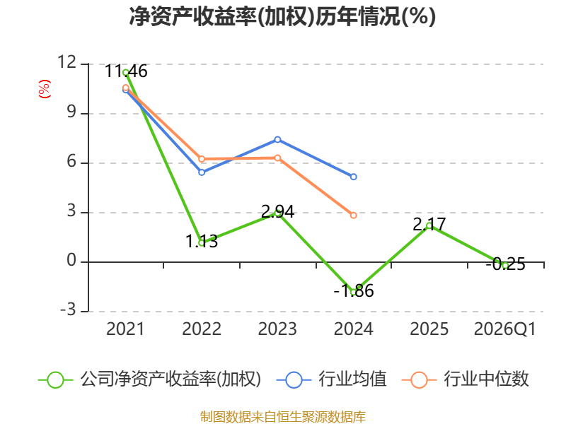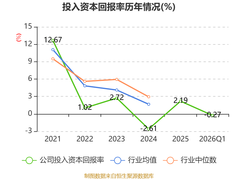 盈利能力方面, 2026年一季度公司加权平均净资产收益率为-0.25%,同比下降0.56个百分点。公司2026年第一季度投入资本回报率为-0.27%,较上年同期下降0.56个百分点。