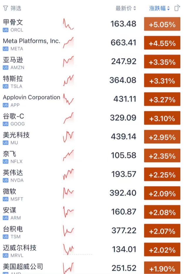 科技股继续成为市场主要支撑。以甲骨文为例,盘初一度上涨7%,在前一交易日大涨逾12%的基础上继续走高。英伟达也延续涨势。以科技股为主的纳斯达克100指数有望创下自2021年以来最长连涨纪录。