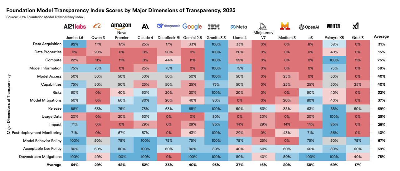 2025年基础模型透明度指数各核心维度得分,图源:斯坦福2026年AI指数报告