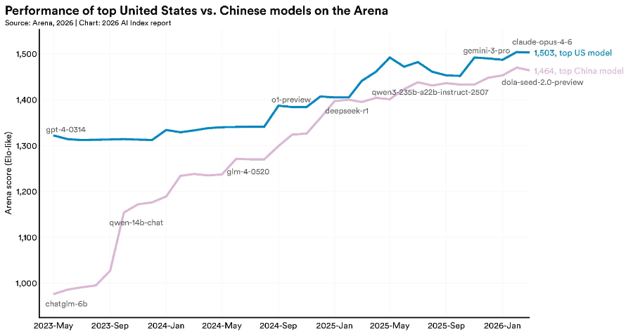 中美顶尖模型在竞技场测评中的表现,图源:斯坦福2026年AI指数报告