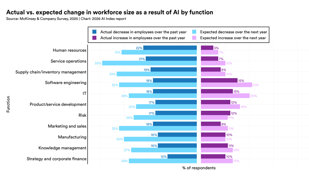 由 AI 导致的各职能部门员工规模过去一年的实际变化 vs.未来一年的预期变化,图源:斯坦福2026年AI指数报告